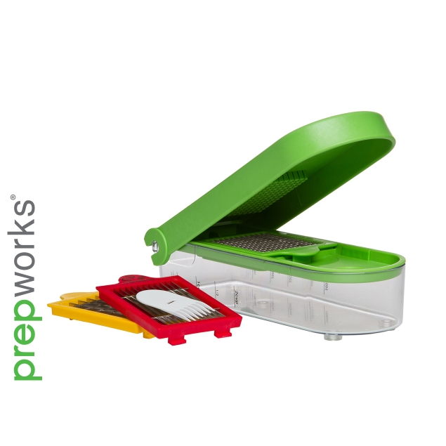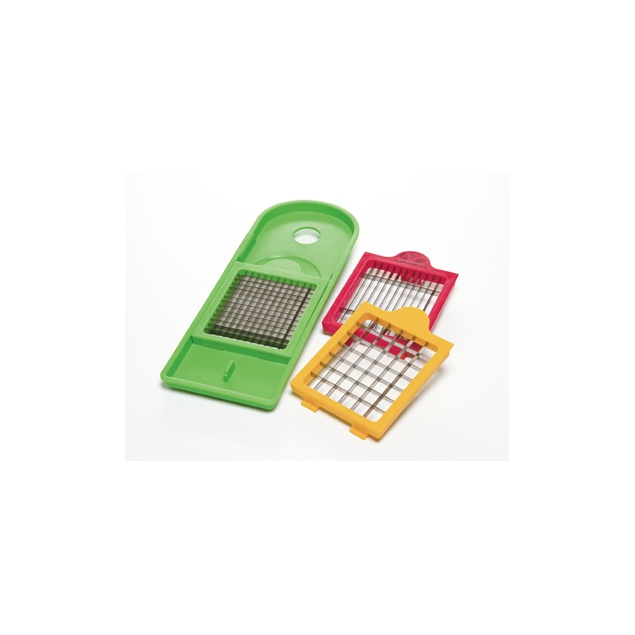 Our progressive Dice and Slice Chopper gives you the power to cut, dice, slice and chop fruits and vegetables for salads, stir-fries and more! This chopper includes three interchangeable blades and a handy cleaning tool. The blade panels store conveniently in the base container, which also measures two cups of chopped produce.