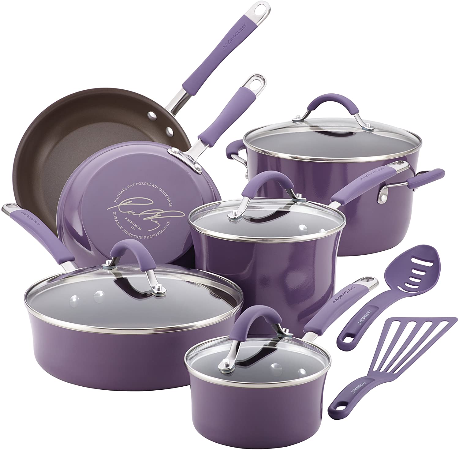 - Convenience and control: The 12-piece cookware set boasts dual-riveted rubberized stainless steel handles and shatter-resistant glass lids; includes slotted turner and spoon